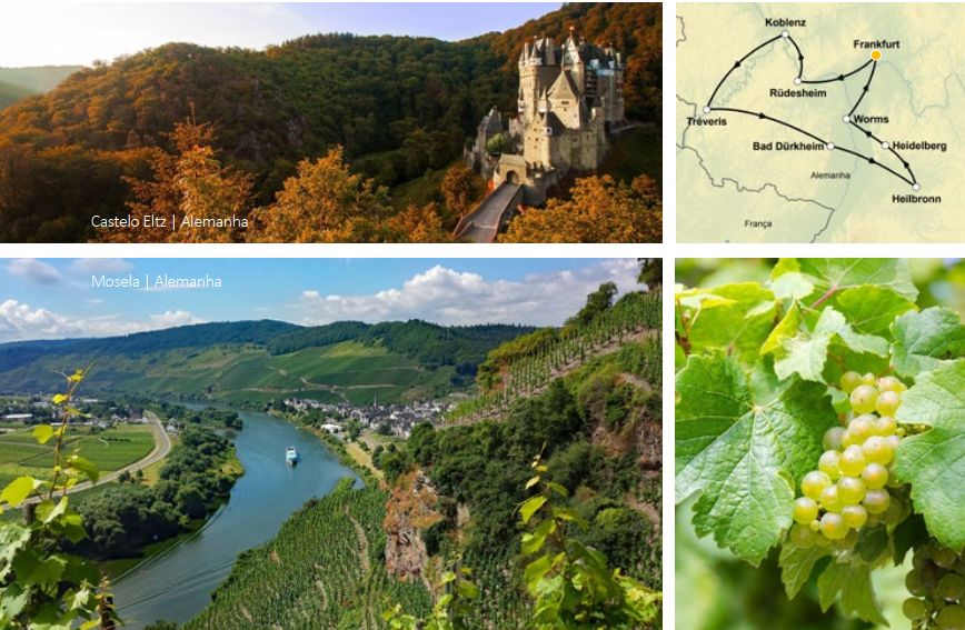 Frankfurt (sem hospedagem), Rüdesheim: Rheingau, Koblenz: O Reno, Castelo Eltz, Tréveris: Mosela, Bockenheim, Bad Dürkheim, Rota Alemã do Vinho, Heilbronn, Heidelberg, Frankfurt (sem hospedagem)